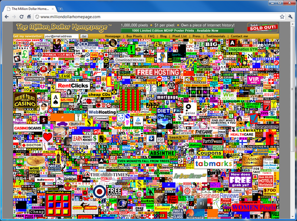 milliondollarad_sm.png The Million Dollar Homepage contains only a single image. That image is a giant, ugly, expensive advertisement. And that giant, ugly advertisement made some college kid in the UK one MILLION dollars. The idea is simple: Create a 1,000,000 pixel image, and sell those pixels off for a dollar each (in blocks of 100). People are free to use those pixels to link to advertise whatever they want (online casinos and scams mostly, it seems). Every single pixel sold out, and Alex Tew of Wilshire England made a cool milli. How could he make so much off of something so dumb? Because he thought of it first