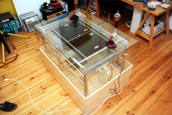 80.jpg Pongmechanik, an electromechanical version of the early electronic tennis game Pong, has its roots in two strands of technological history. The first follows the transition from the elaborate machines of computer pioneer Konrad Zuse, which had their inner workings prominently displayed inside glass cabinets, to the black boxes of today’s computers, which generally hide their internal processes from view. The second follows the shift from Pong’s abstract representation of sport, a generation ago, to the increasingly realistic representations seen in contemporary video games. Pongmechanik contrasts these two trajectories by marrying the earliest manifestations of those threads. A physical version of the Ur-video game, Pongmechanik’s highly visible logic circuit, constructed from telephone relays like Zuse used, responds to joystick-guided cues that maneuver a white plastic square and rectangles (the ball and rackets) across the play field. PongmechanikPongmechanik Pongmechanik is an electromechanical conversion of the classical game Pong. And instead of more realistic graphics, it ever accurately to reproduces the original Pong. The user is hardly changed. However the game breaks open the Black box: What takes place in the computer, becomes again perceptible and comprehensible. Pongmechanik is an absolutely physical game. The game is realized electromechanically, and essentially consists of four elements: A relay computer, the mechanical movement with collision detection, the display and the acoustic components. relaiscomputer.jpg Element 1: The relay computer controls the game. It consists entirely of used telephone relays, no semiconductors such as transistors or microprocessors were used. Contrary to modern electronic components, all operatins are visible and audible with the relays. Element 2: The movements of ball and racquet, as well as the collision detection take place in a metal chassis under the glass cover. Each moving game compoent has a mechanical counterpart, which is moved by electric motors. When these parts collide, contacts are closed and the relays in the computer switch the direction of rotation of the motors. mechanik.jpg Element 3: The movement of the mechanical parts is transferred via strings and guide pulleys to the display. The display consists of two closely spaced glass plates. The playing field is painted on the lower plate. The ball, represented by a white plastic square, is moved between the two plates by black string. The raquets, represented by two white plastic rectangles, are moved by string on the upper glass plate. The score is shown by rotating discs visible through openings in the playing field. klang.jpg Element 4: The sound is produced by two wooden sound blocks, which are struck by the core of two solenoids. The computer controls both solenoids. Together, these four elements produce an exact copy of the classical Pong. But there is more: The game is brought to a physically understandable and comprehensible level. Added to the game is the fascination of a comprehensible mechanism. The classical video game inspires two players. Pongmechanik additionally pulls otherwise indifferent spectators into its spell. They have the liberty to investigate the mechanics of the game in detail. Video Link: http://vimeo.com/7548051Source: http://www.cyberniklas.de/Attachments:Number of Attachments: 4 klang.jpgAttachment Comments: The sound blocks Number of Downloads: 3204 Filesize: 15.96 KB mechanik.jpgAttachment Comments: Mechanical Chassis Number of Downloads: 3204 Filesize: 18.67 KB relaiscomputer.jpgAttachment Comments: Relay computer Number of Downloads: 3204 Filesize: 22.30 KB 80.jpgNumber of Downloads: 3204 Filesize: 86.76 KB