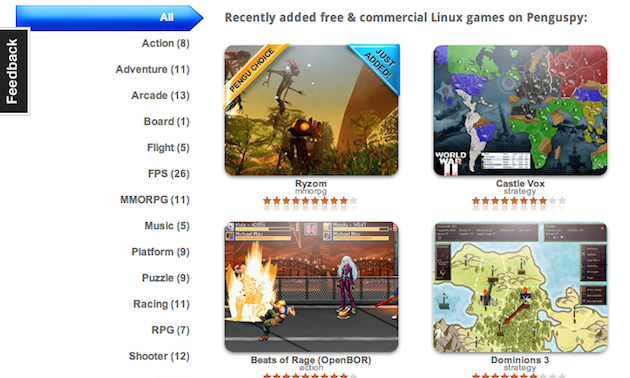 If you've already played through Warcraft III, The Sims 3, and all the other heavily Wine-compatible games out there, PenguSpy is a great resource for Linux gamers. Whether you're looking for arcade games, board games, MMORPGs, or first person shooters, PenguSpy will have a good number of games to recommend to you. The site's very simple to navigate; you just pick a category (or search for a title) and check out the recommended games. Clicking on a game not only gives you a rating, description, comments, and a link to the homepage, but each page also has a YouTube video of the game so you can get a closer look. It allows you to sort by through both free games and commercial games. They also have an RSS Feed you can subscribe to so that you know when they add new games. Hit the link to check it out, and share your own favorite Linux games with us in the comments.