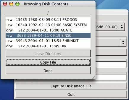 The FC5025 includes a graphical Disk Image and Browse tool for Linux, Mac OS X and Windows. This program allows you to make an image copy of an inserted floppy, suitable for use under emulators or for archival use. On some but not all types of disks, the Disk Image and Browse tool can also display a file listing and copy individual files from the disk. Screenshots of the Disk Image and Browse tool are available.