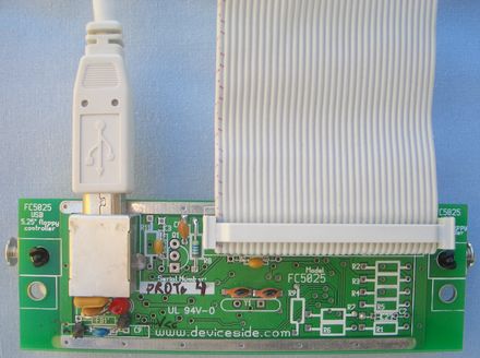 Device Side Data's FC5025 USB 5.25" floppy controller plugs into any computer's USB port and enables you to attach a 5.25" floppy drive. Even if your computer has no built-in floppy controller, the FC5025 lets you read those old disks. And it's not just for IBM PC disks – it also understands formats used by Apple, Atari, Commodore and TI, among others.