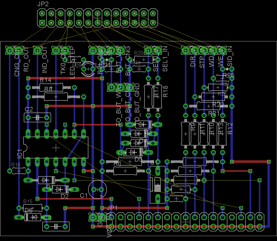 Basically, for the input lines there are pull-up resistors and voltage dividers to adapt the 5V to the 3V3 of the Raspberry PI. The SEL1 line pass through a switch so we can disable the second drive, needed if you want to attach external drives (for ripping a real floppy disk into adf file in SD).