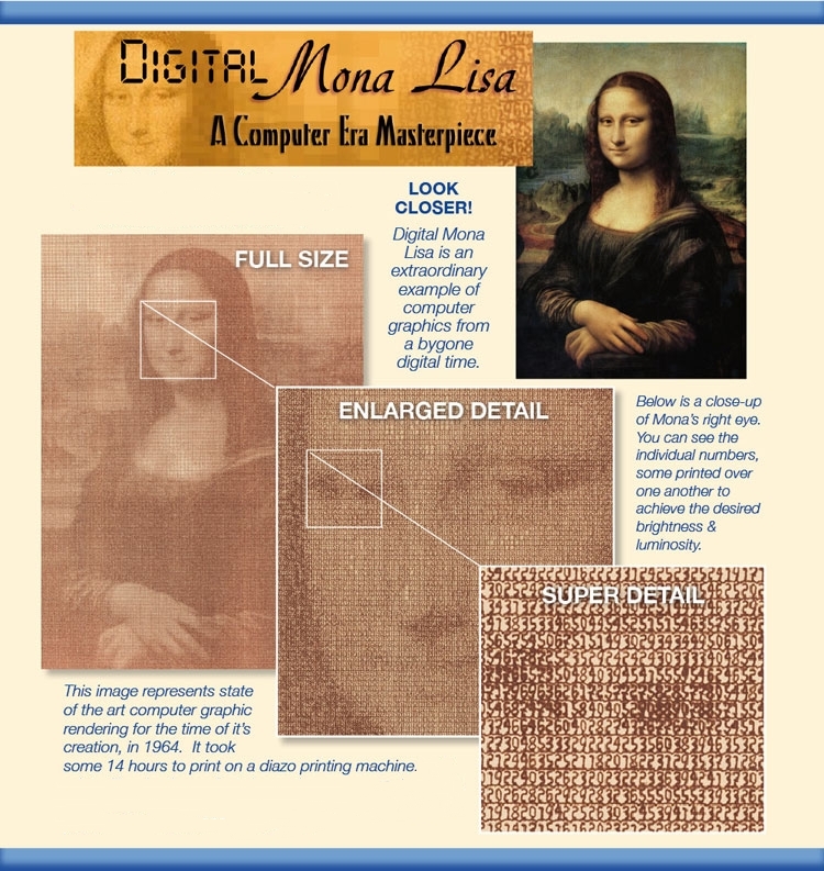 In 1964, H. Philip Peterson of Control Data Corporation (CDC) used a CDC 3200 computer and a "flying-spot" scanner to create a digital representation of the Mona Lisa. The image contained 100,000 pixels that were plotted using numerals, sometimes overprinted, to approximate the required density and took 14 hours to complete.