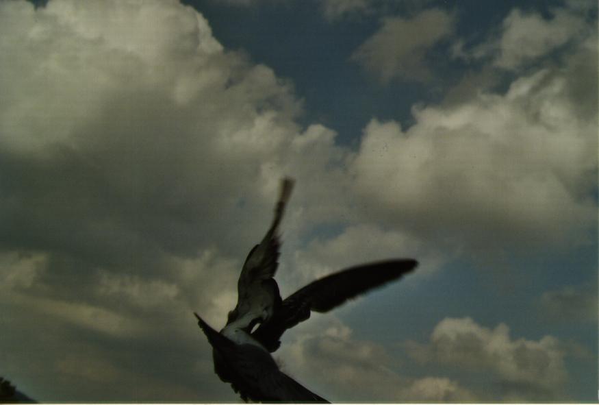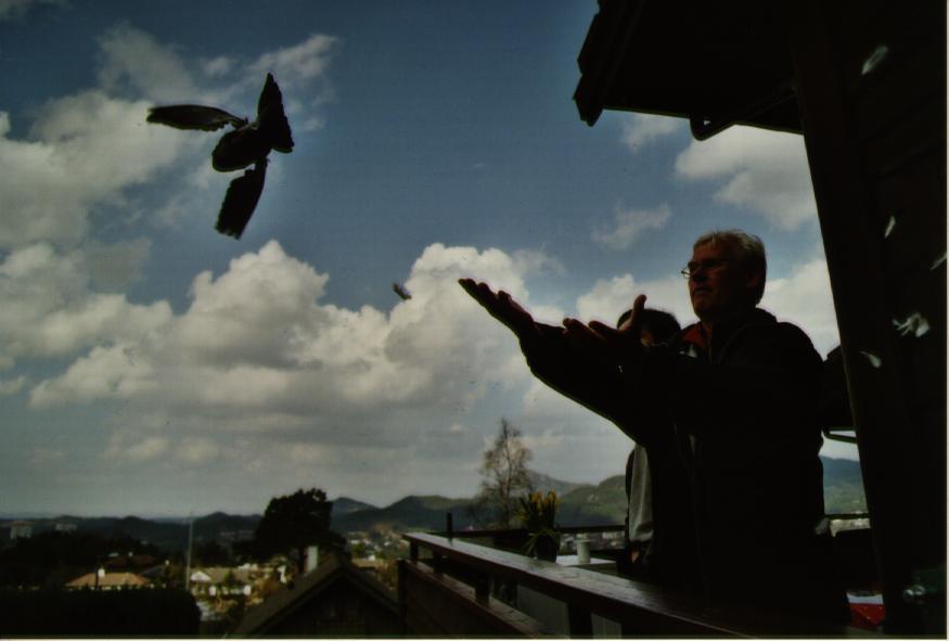 But the instincts won at last, and after about an hour of fun, we could see a couple of pigeons breaking out of the flock and heading in the right direction. There was much cheering. Apparantly, it WAS our pigeons, because not long after, we got a report from the other site that the first pigeon was sitting on the roof.