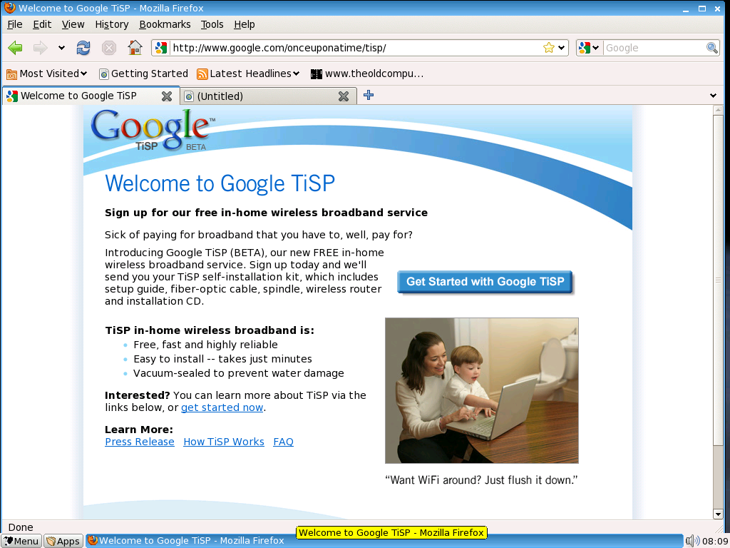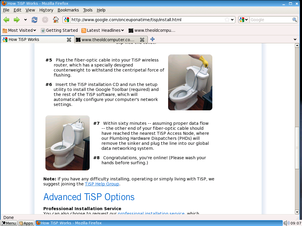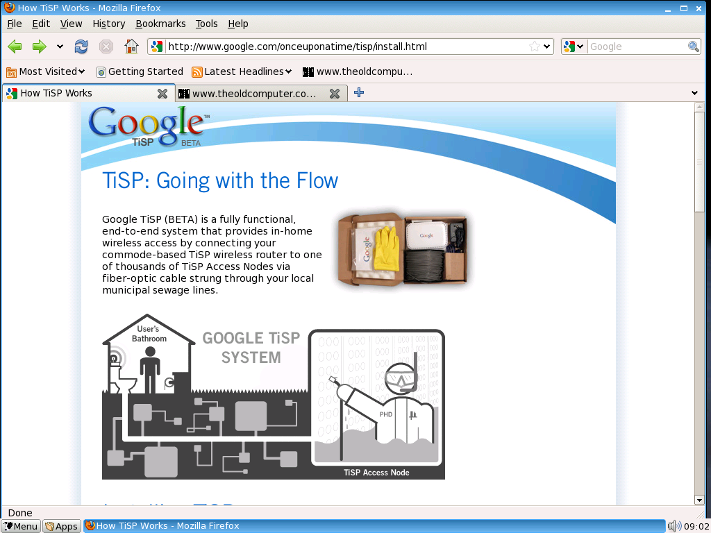 MOUNTAIN VIEW, Calif., April 1, 2007 - Google Inc. (NASDAQ: GOOG) today announced the launch of Google TiSP (BETA)™, a free in-home wireless broadband service that delivers online connectivity via users' plumbing systems. The Toilet Internet Service Provider (TiSP) project is a self-installed, ad-supported online service that will be offered entirely free to any consumer with a WiFi-capable PC and a toilet connected to a local municipal sewage system.