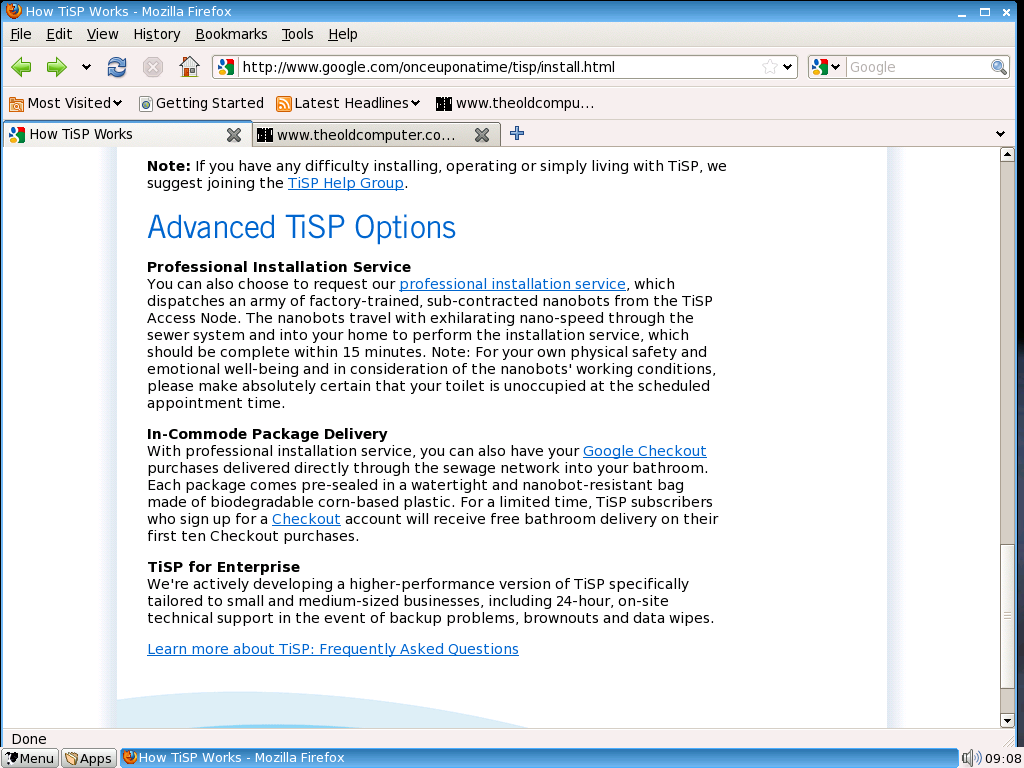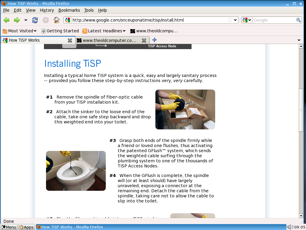 Users who sign up online for the TiSP system will receive a full home self-installation kit, which includes a spindle of fiber-optic cable, a TiSP wireless router, installation CD and setup guide. Home installation is a simple matter of GFlushing™ the fiber-optic cable down to the nearest TiSP Access Node, then plugging the other end into the network port of your Google-provided TiSP wireless router. Within sixty minutes, the Access Node's crack team of Plumbing Hardware Dispatchers (PHDs) should have your internet connection up and running.
