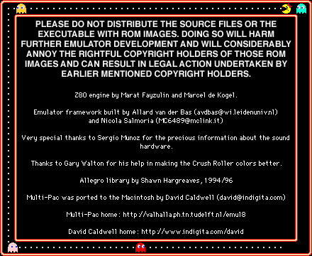 NOTE: While Multipac was cool in its time, it is now obsolete. Actually, it became "MAME" which has got to be the coolest arcade emulator out there. So Multipac is not of much use any more, unless you want to run at 3x3 pixel size, or unless you are having a bit of a nostalgia kick and want to see where MAME came from.