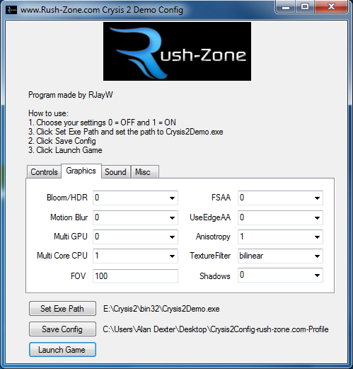 Nothing feels better than tweaking the bits other people can't reach. So it overjoyed me to discover a fully functioning Crysis 2 tweak utility. You need to get this, if for no other reason than it can eliminate the annoying intro nonsense, but beyond that it does provide a host of controls. So if you're finding your FPS a bit low then go grab a copy and get the ability to fiddle with HDR, FSAA, Motion Blur, Edge AA, plus visual gaming enhancements such as FOV.