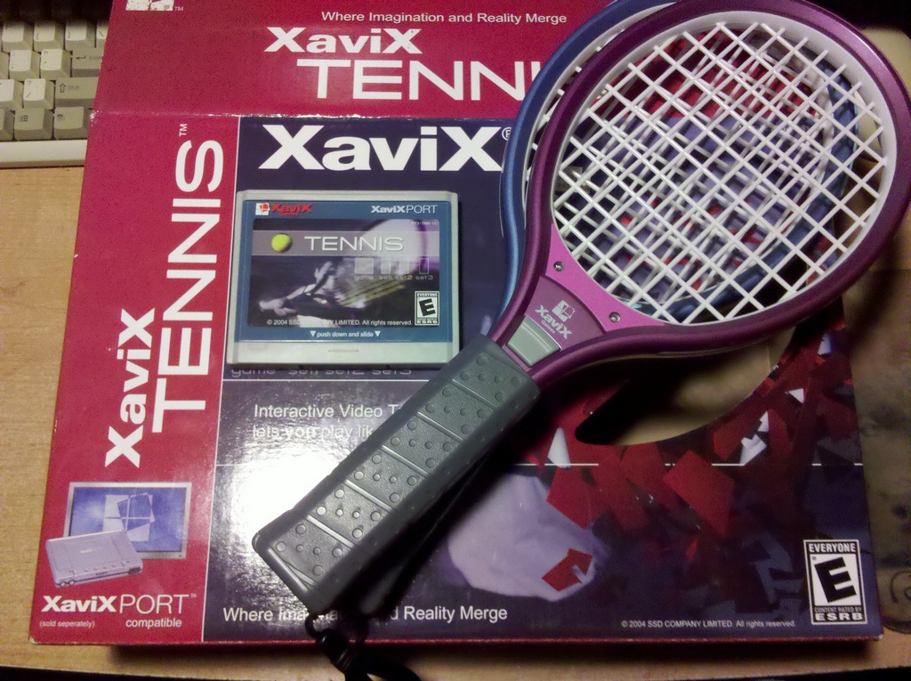 this is the tennis game for the XaviX PORT. the box included the cartridge, two rackets and the instruction manual.