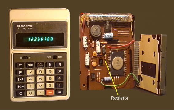 Sadly, that calculator did not survive my adolescence, however my next one did. It is a Sanyo CZ-8113 from 1977. Like the old Technipet, I also overclocked it, and I have dug it out and dusted it off for it to be included here. Unlike most computers/calculators, this one generated the clock signal entirely within the calculator chip. An external resistor (as shown in the picture below), determined the frequency. As standard, this resistor was 56 K ohms. Changing it to 5.6 K ohms gave an approximate doubling of speed. Reducing the value of this resistor further made the "function" key inoperative. Of course, another side effect was to increase battery consumption......but we overclockers never worry about such things!