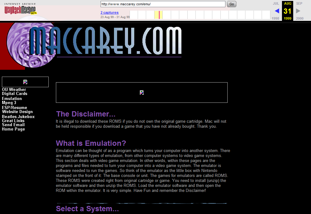 Okay, due to the quasi legal status of ROM images, it is deemed necessary to place a vivid legal disclaimer on this site. Laws vary from country to country on the legality of owning or transmitting ROM images. For the most part, you are required to be in actual possession of the PC Board (PCB) in order to legally retain a copy of the ROM. Check with your local authorities before downloading ANYTHING from this site. Regardless of your actions, maintainers of TheOldComputer.com, will not be held legally responsible. If you download anything from this site, you do so, implying consent that you alone, hold all due responsibility. Warning given. Any software that is on the site against the wishes of an individual or company will be removed without question.