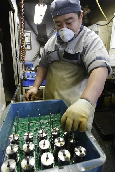 A factory worker inspects components of the inner core of the Gamesphere for assembly.