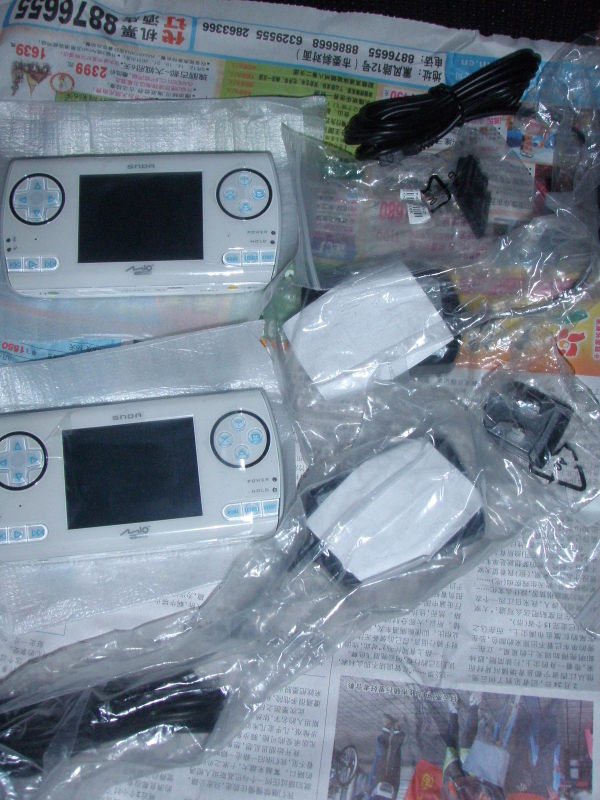 Each unit appears brand new. They are both white, with removable plastic film still covering the screen. They each have a custom wall charger. No box was ever produced, so they came in plastic bags and soft pink foam. A small barcode sticker is on the back of the system. These appear to be enabled with both BlueTooth and WiFi, but I have not yet tested these features. There is a slot on the top, between the speakers, that accepts SD and MMC cards. The unit has a touch screen, and a small retractable stylus is included. The EZ Mini takes a second for the load screen to activate. The main menu offers games, Music, video, ebooks, and downloads. These menus appear in a combination of Chinese and English. As you can see, the EZ Mini is about the same length and thickness as a DS Lite, in it's closed position.